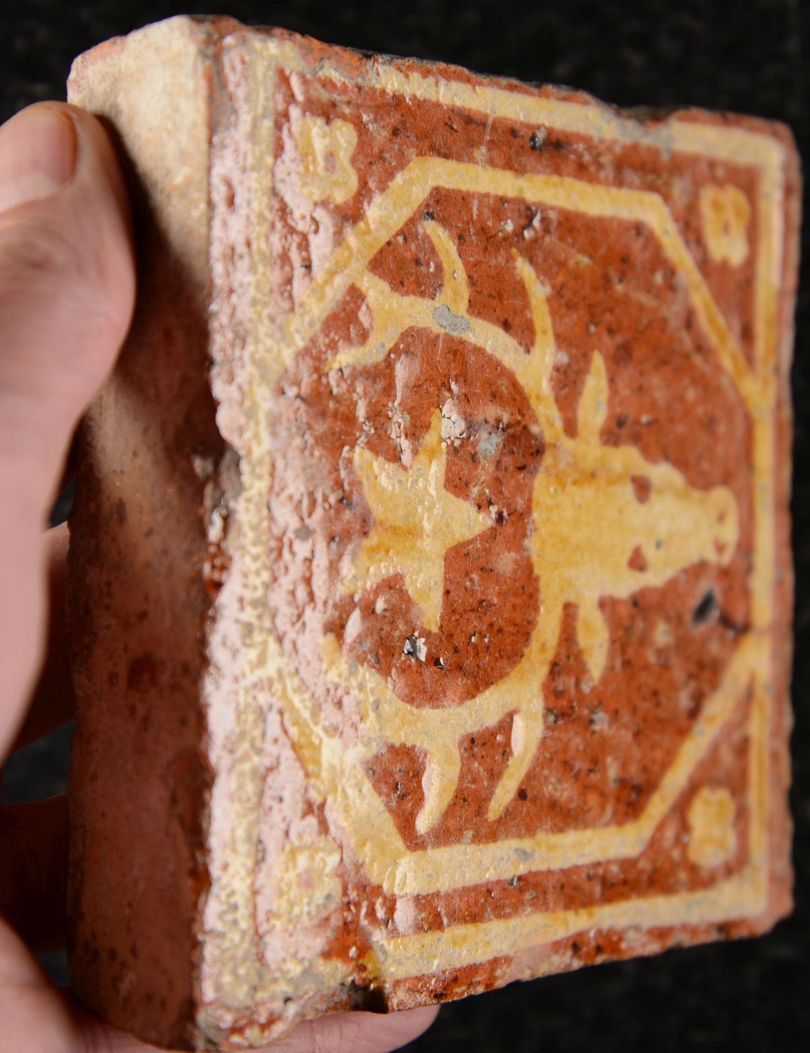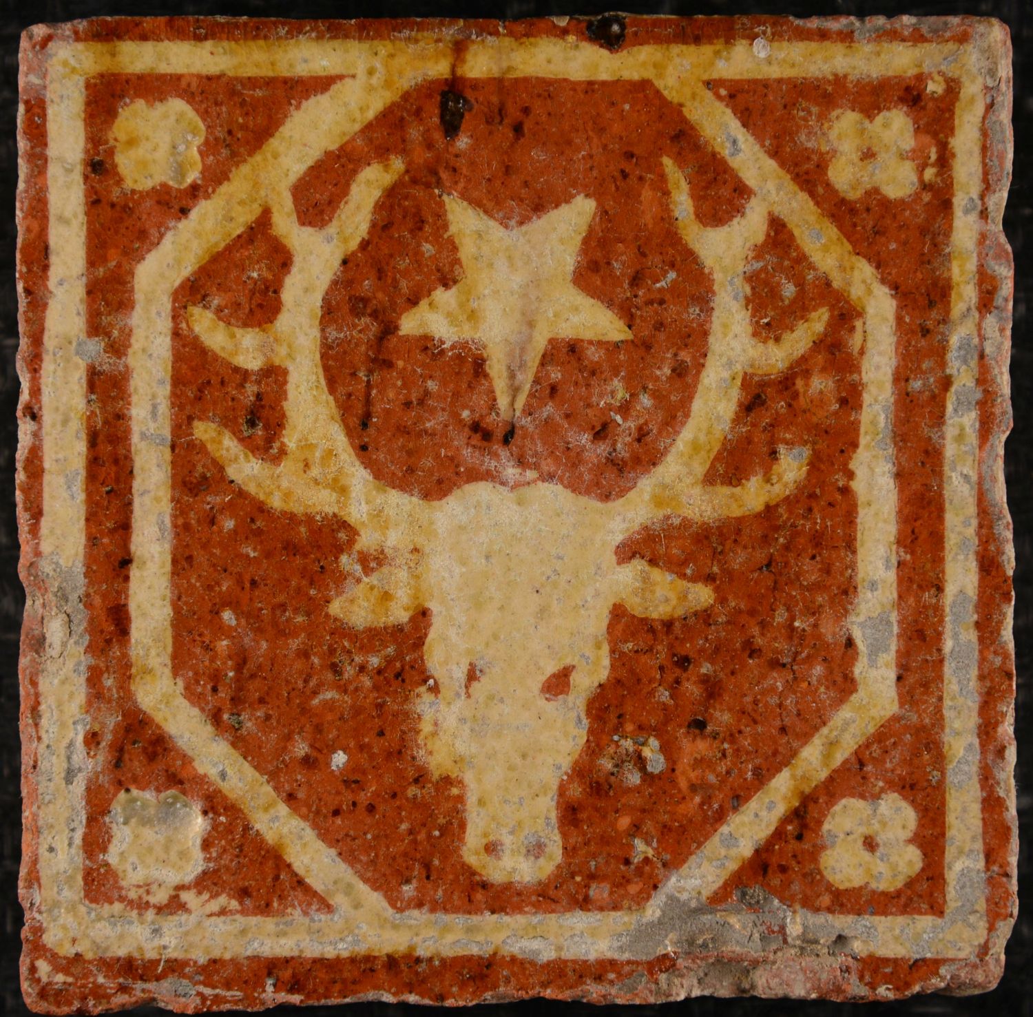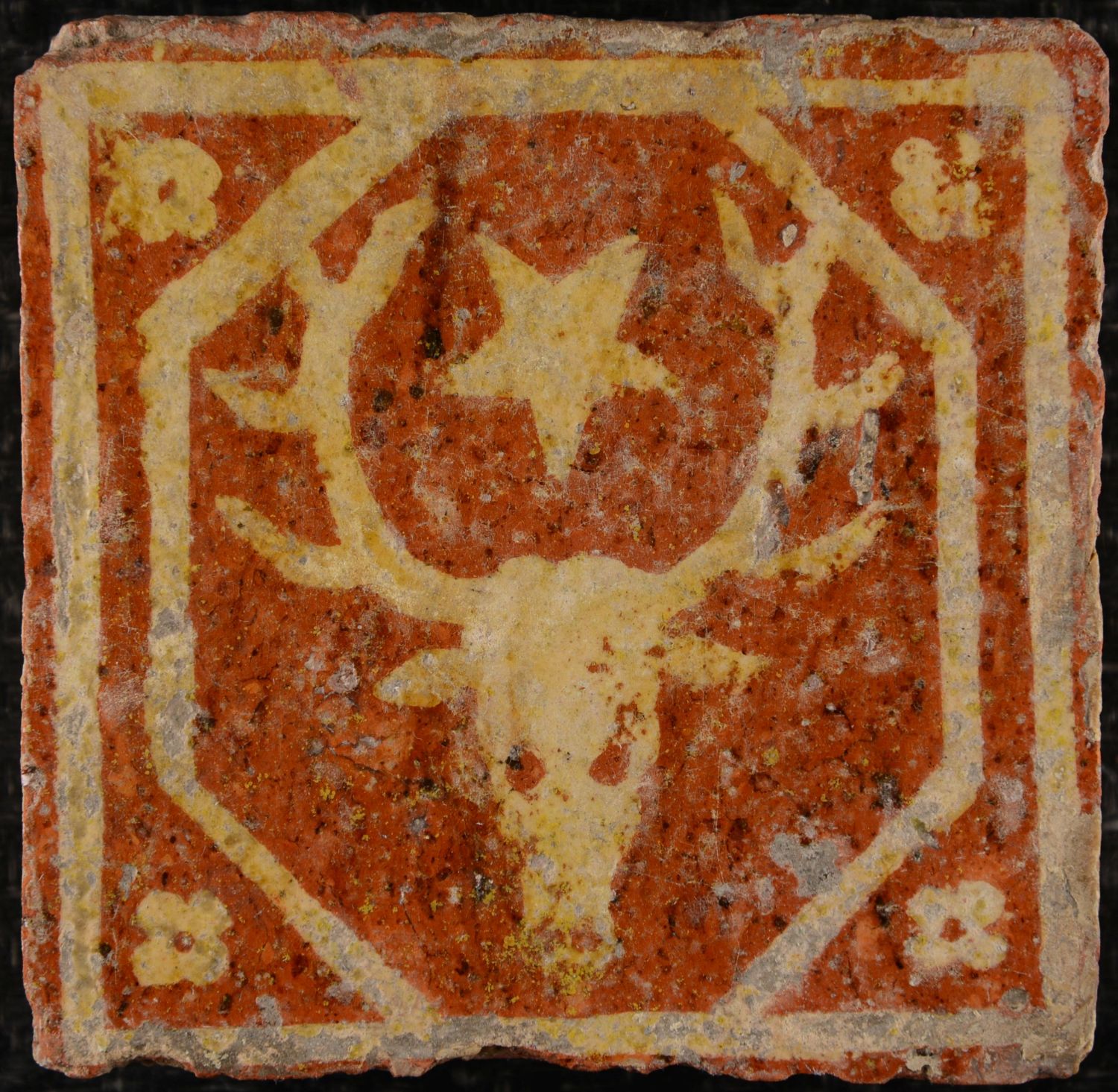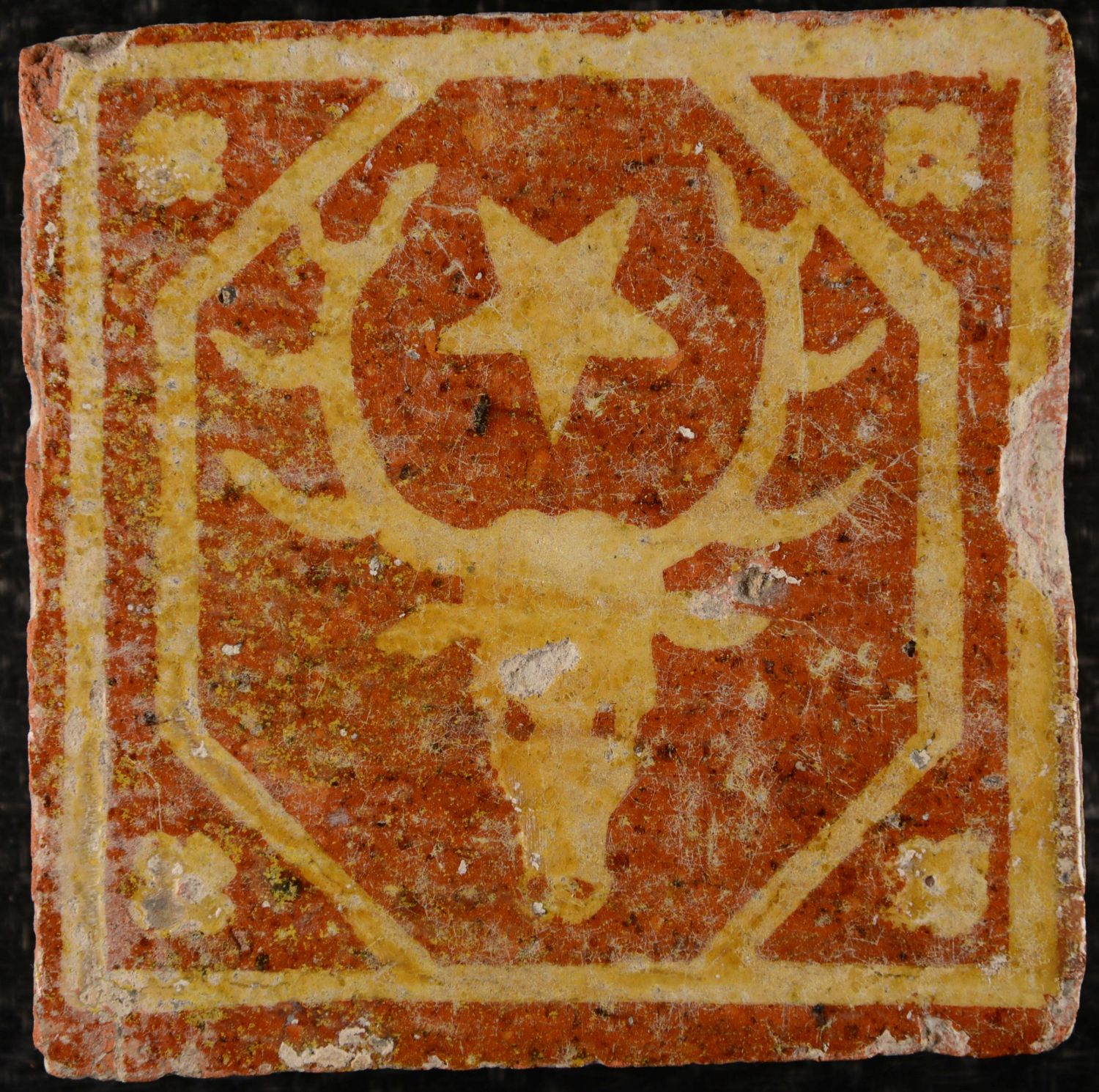 Rare glazed tile with engobe decoration, 120 x 120 mm, coat of arms of Pierre de Nivelle, abbot of Cîteaux (1625-1635), from the Château de Gilly-lès-Cîteaux, Argilly workshop, Burgundy, France early 17th century. The arms of Gilly-lès-Cîteaux feature the crest of a golden hind with a cross or five-fingered star above. Good condition considering the age and function of floor tile. Good original patina. 4 tiles available.