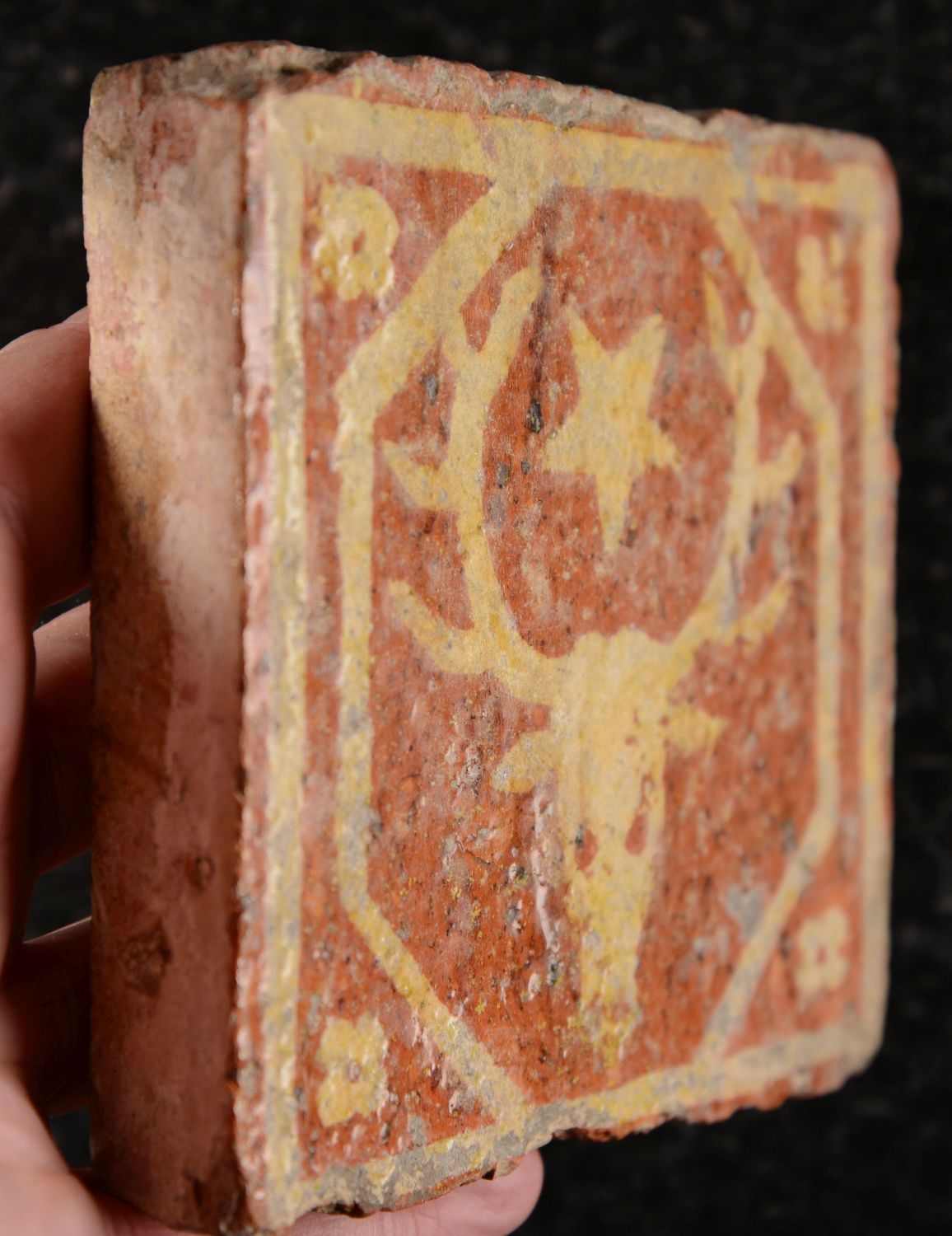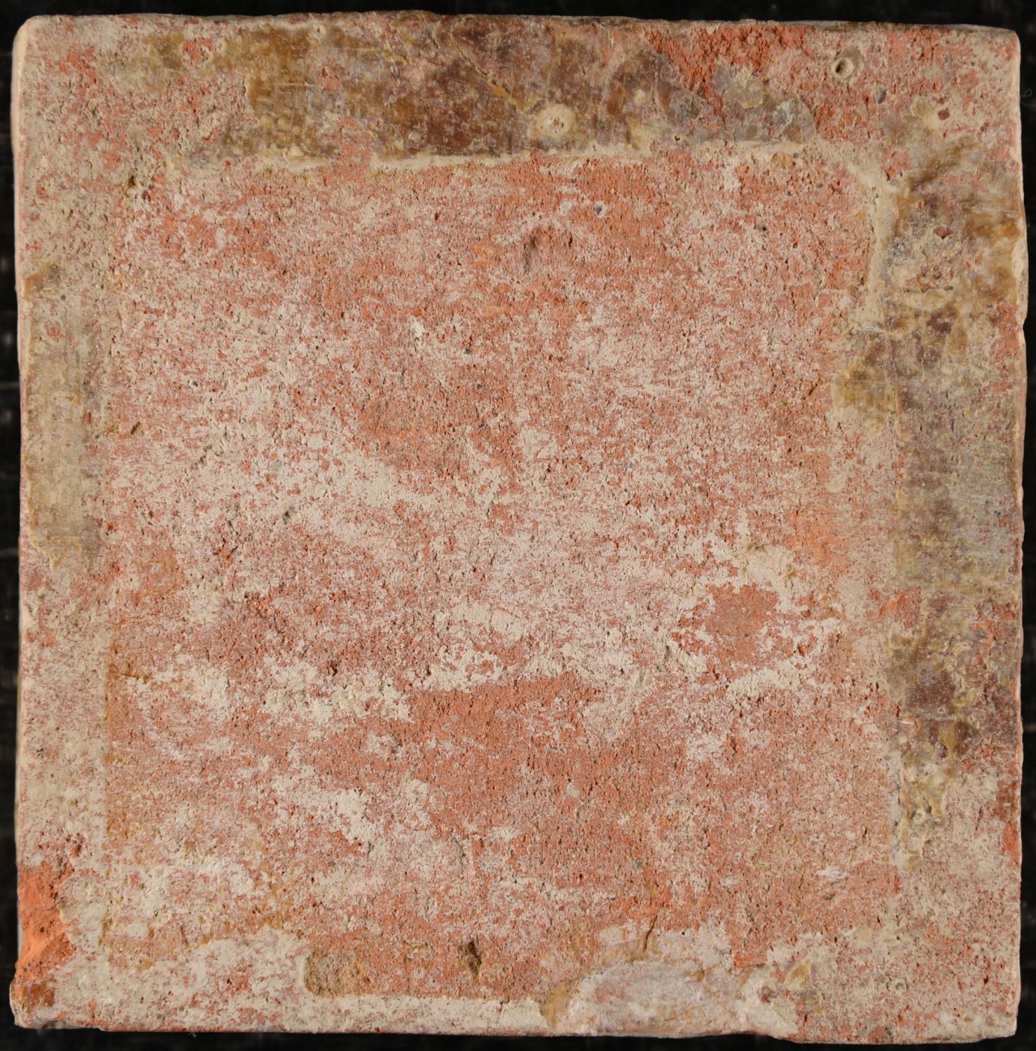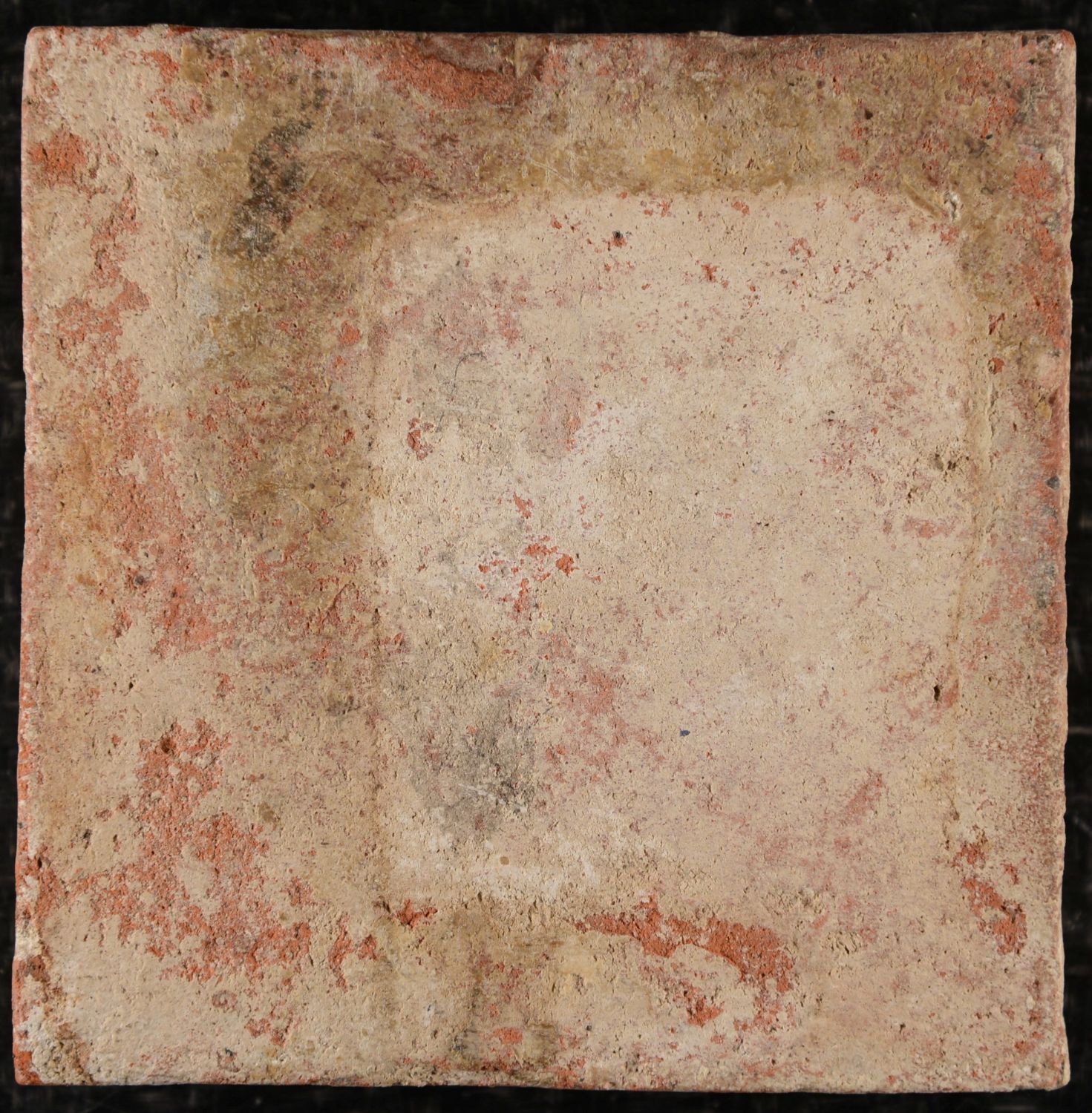 Rare glazed tile with engobe decoration, 120 x 120 mm, coat of arms of Pierre de Nivelle, abbot of Cîteaux (1625-1635), from the Château de Gilly-lès-Cîteaux, Argilly workshop, Burgundy, France early 17th century. The arms of Gilly-lès-Cîteaux feature the crest of a golden hind with a cross or five-fingered star above. Good condition considering the age and function of floor tile. Good original patina. 4 tiles available.