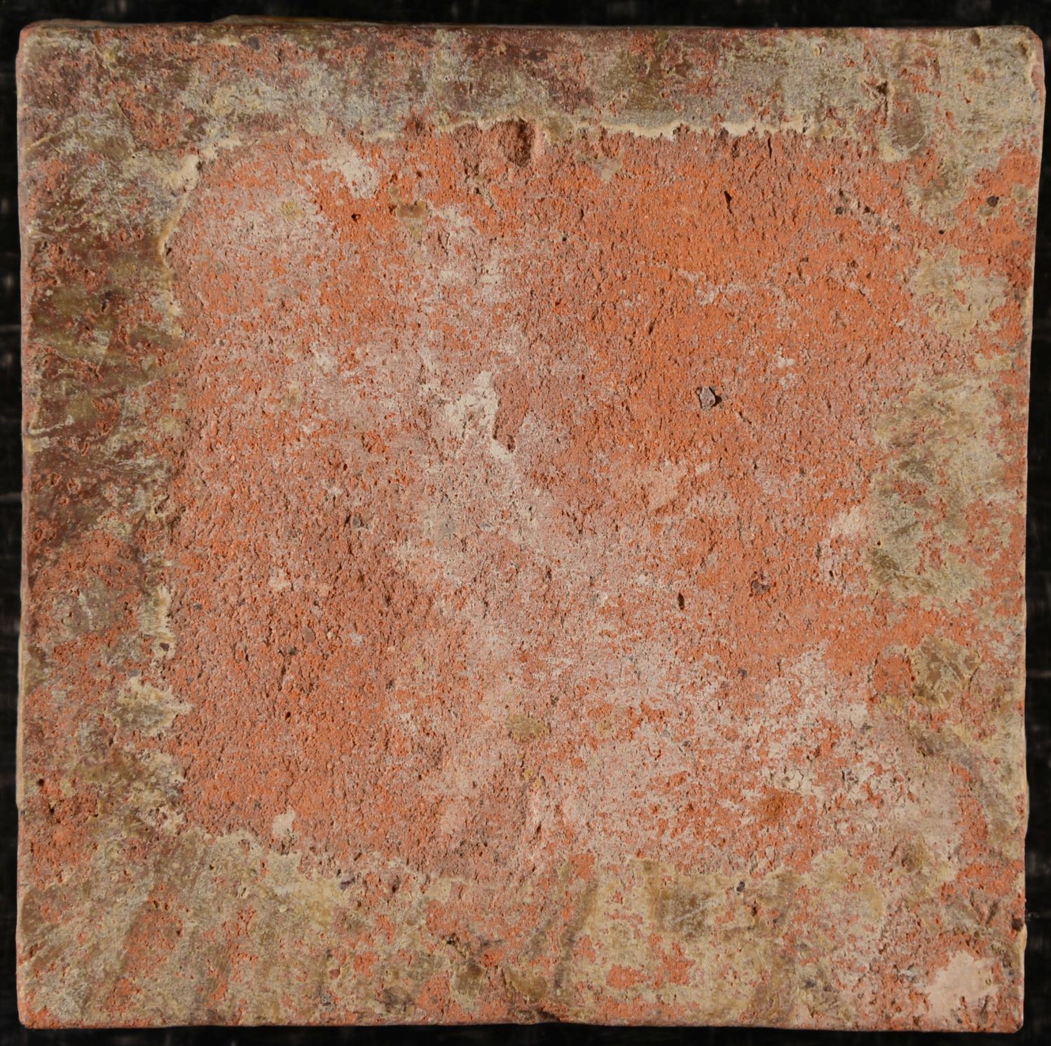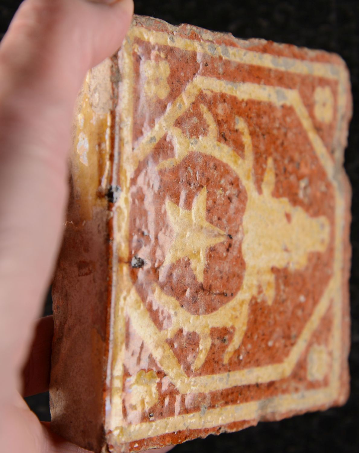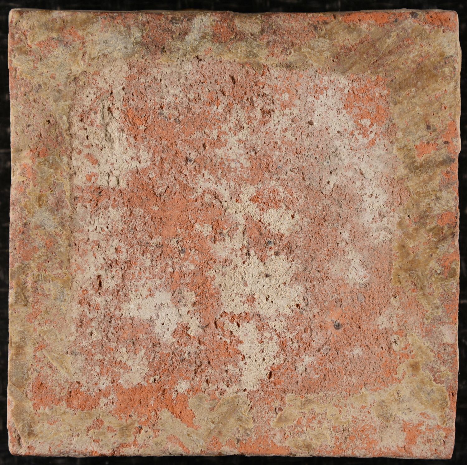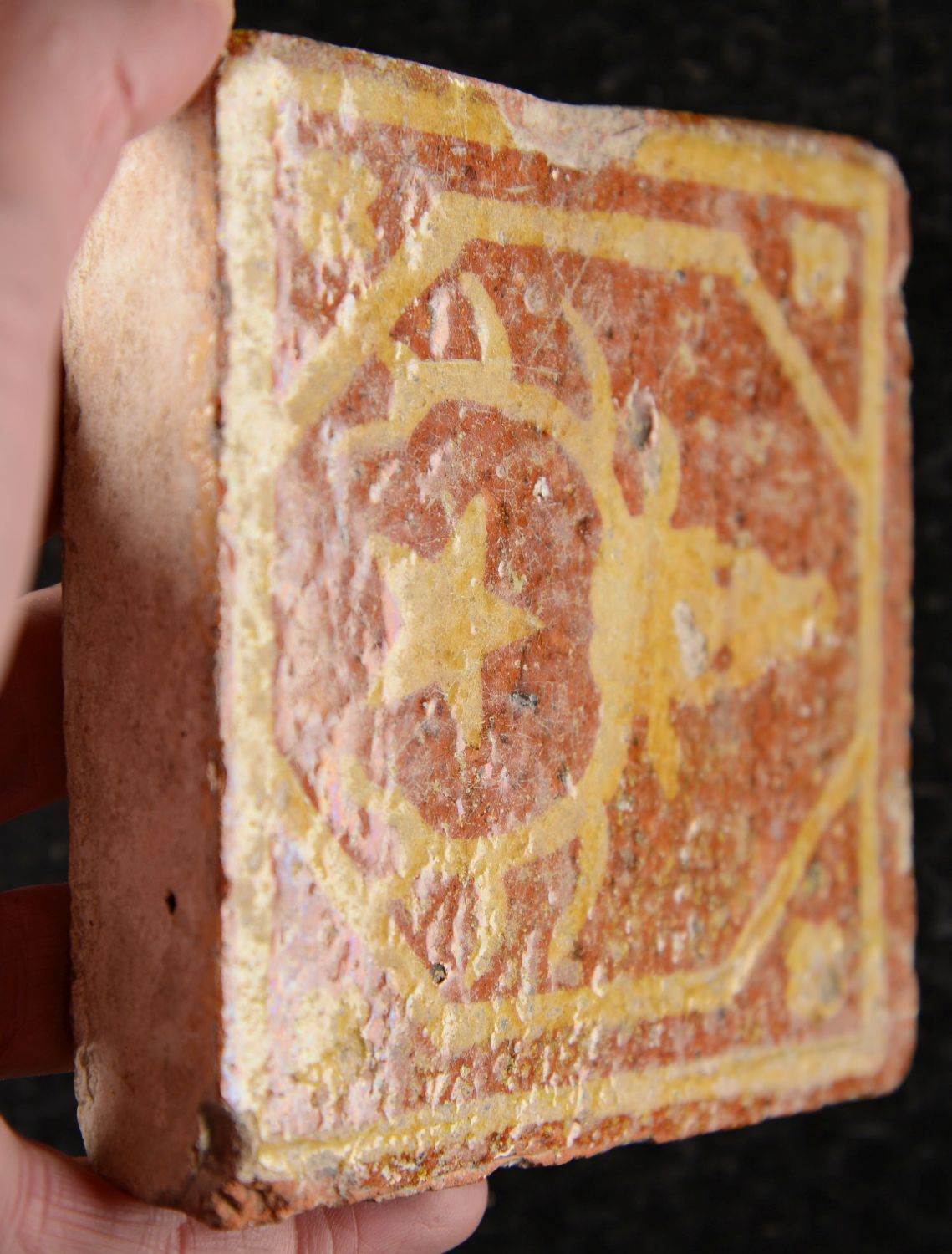 Rare glazed tile with engobe decoration, 120 x 120 mm, coat of arms of Pierre de Nivelle, abbot of Cîteaux (1625-1635), from the Château de Gilly-lès-Cîteaux, Argilly workshop, Burgundy, France early 17th century. The arms of Gilly-lès-Cîteaux feature the crest of a golden hind with a cross or five-fingered star above. Good condition considering the age and function of floor tile. Good original patina. 4 tiles available.