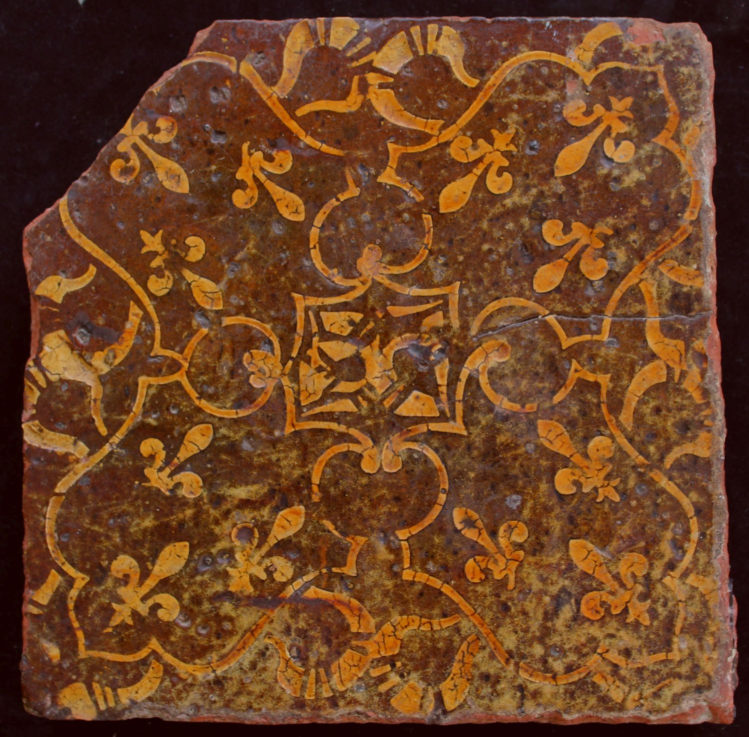 Large size late medieval floor tile. Depicted are four shields with the fleur-de-Lys of France, surrounded by semi-arches that could represent a horn. The size as well as the decoration of these tiles suggests Champagne-Ardenne as a region of origin, where floor tiles of this size have been used in several church buildings. It is typical that on comparable specimens in different churches the shields point inwards, but otherwise all decor elements in our tiles are the same! This could indicate the use of a single wooden stamp that was used four times to apply the decor in the still plastic clay! In the parish church (église paroissiale) of Saint-Gengoul (Yonne) a smaller size tile has been used on which a similar shield with horns is depicted only once. The production date of our tiles is probably 2nd quarter of the 16th century, when a floor of this type of tile was placed at the church of Saint-Nicolas in Troyes. This tile has probably been situated on the edge of the floor area, because the surface glaze and patina is flawless. A corner has been cut, this happened a long time ago, possibly during the installation. The tile has a small firing crack.