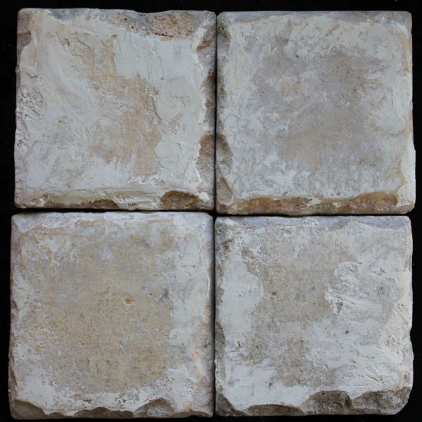 A set of 4 tiles with Acanthus leaves made in the first half of the 17th century. This design was first mentioned in 1570 when King Philip II ordered several thousand tiles of this design in blue in Talavera. Later this design in polychrome was produced in Seville and also Barcelona. Tiles are in very good condition with beautiful bright glaze. Sides and corners with some glaze chips. Some glaze bubbles to glaze. Backside cut to all four sides, which is usually the case for these early spanish tiles.