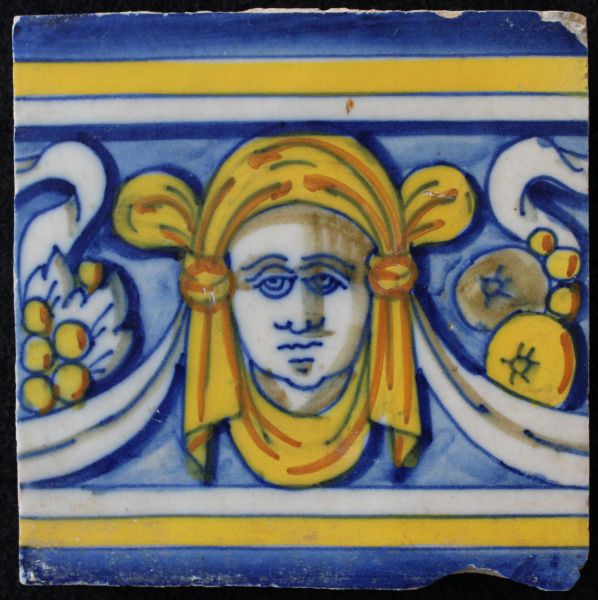 Spanish tile, border design depicting a face. Good condition tile with bright glaze.